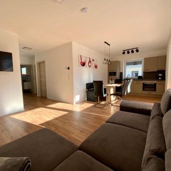 Die Wohnung empfängt euch mit einem offenen, lichtdurchfluteten Wohn- und Essbereich. Die voll ausgestattete Küche, der gemütliche Essbereich und die ausziehbare Couch laden zum gemeinsamen Kochen, Essen und Entspannen ein. Alles Notwendige – Geschirr, Toaster, Spülmaschine, TV und ein Kaffeevollautomat – ist vorhanden, um euren Aufenthalt so komfortabel wie möglich zu gestalten.